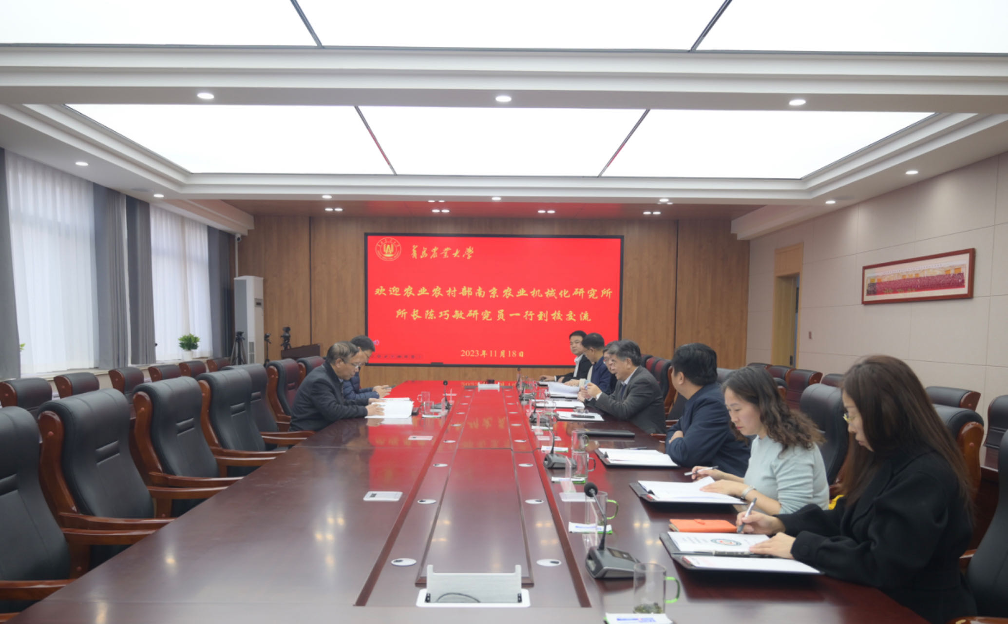 11月18日,农业农村部南京农业机械化研究所所长陈巧敏研究员、农业农村部南京农业机械化研究所科技管理处处长常春研究员一行至ok138cn太阳集团古天乐调研交流,校党委委员、副校长田义轲、校学术委员会主任尚书旗出席座谈会,学院党委书记焦磊、副院长王家胜陪同调研。