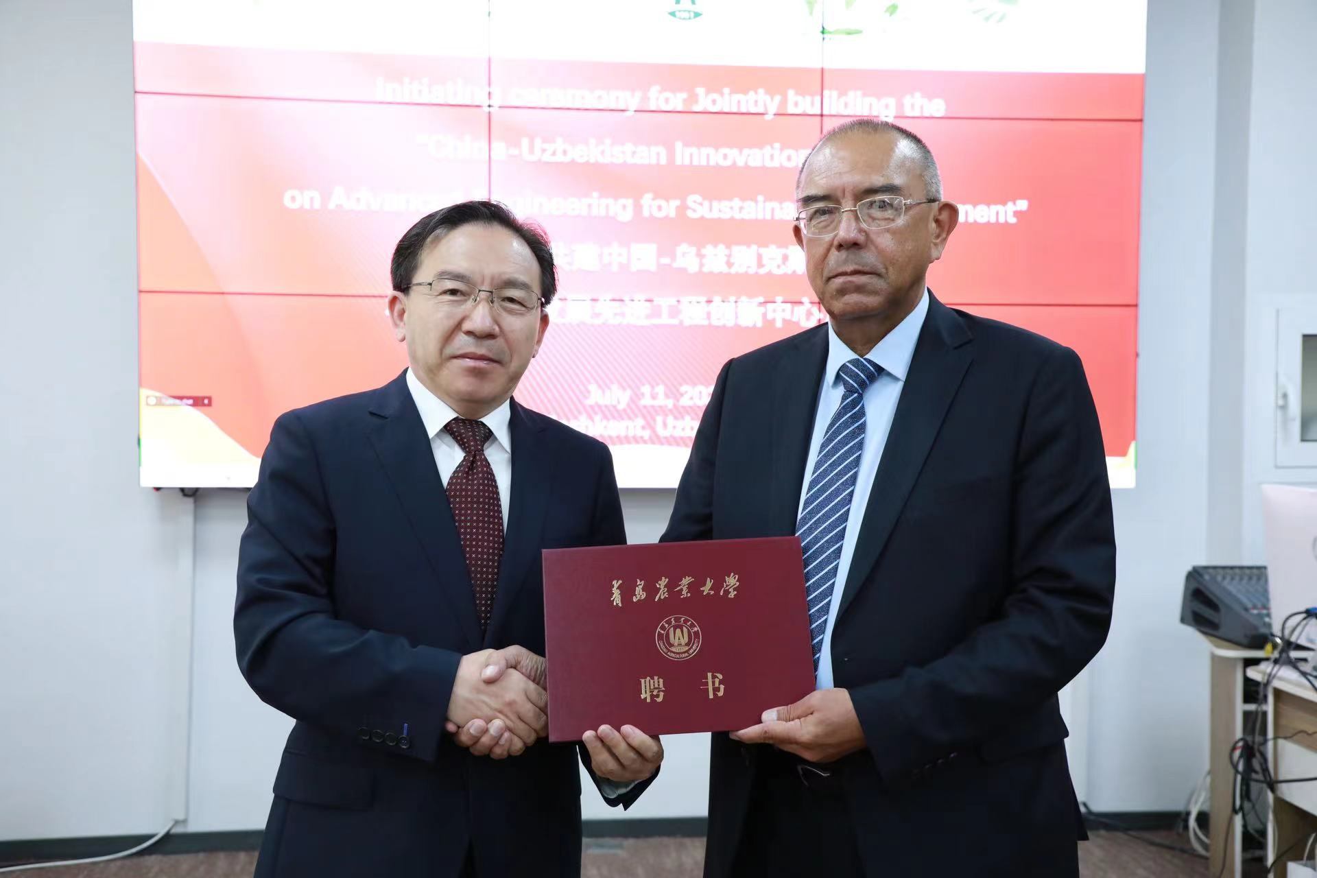 启动仪式上,双方签署了中心共建协议,共同为“中国—乌兹别克斯坦农业可持续发展先进工程创新中心”揭牌。赵金山为阿利姆·普拉托夫颁发了ok138cn太阳集团客座教授聘书。