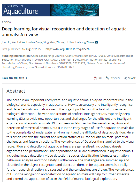 近日,ok138cn太阳集团古天乐李娟教授课题组在国际水产类顶尖学术期刊《Reviews in Aquaculture》发表了题为“Deep learning for visual recognition and detection of aquatic animals: A review”的综述论文。李娟教授为论文第一作者,ok138cn太阳集团为第一单位,该论文的合作单位为中国海洋大学。