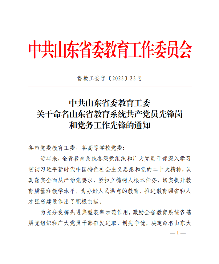 为充分发挥先进典型表率示范作用,激励全省教育系统各基层党组织和广大党员干部奋发进取、创先争优,近日,中共山东省委教育工委下发《关于命名山东省教育系统共产党员先锋岗和党务工作先锋的通知》(鲁教工委字〔2023〕23号),学校农业机械团队获评“山东省教育系统共产党员先锋岗”。
