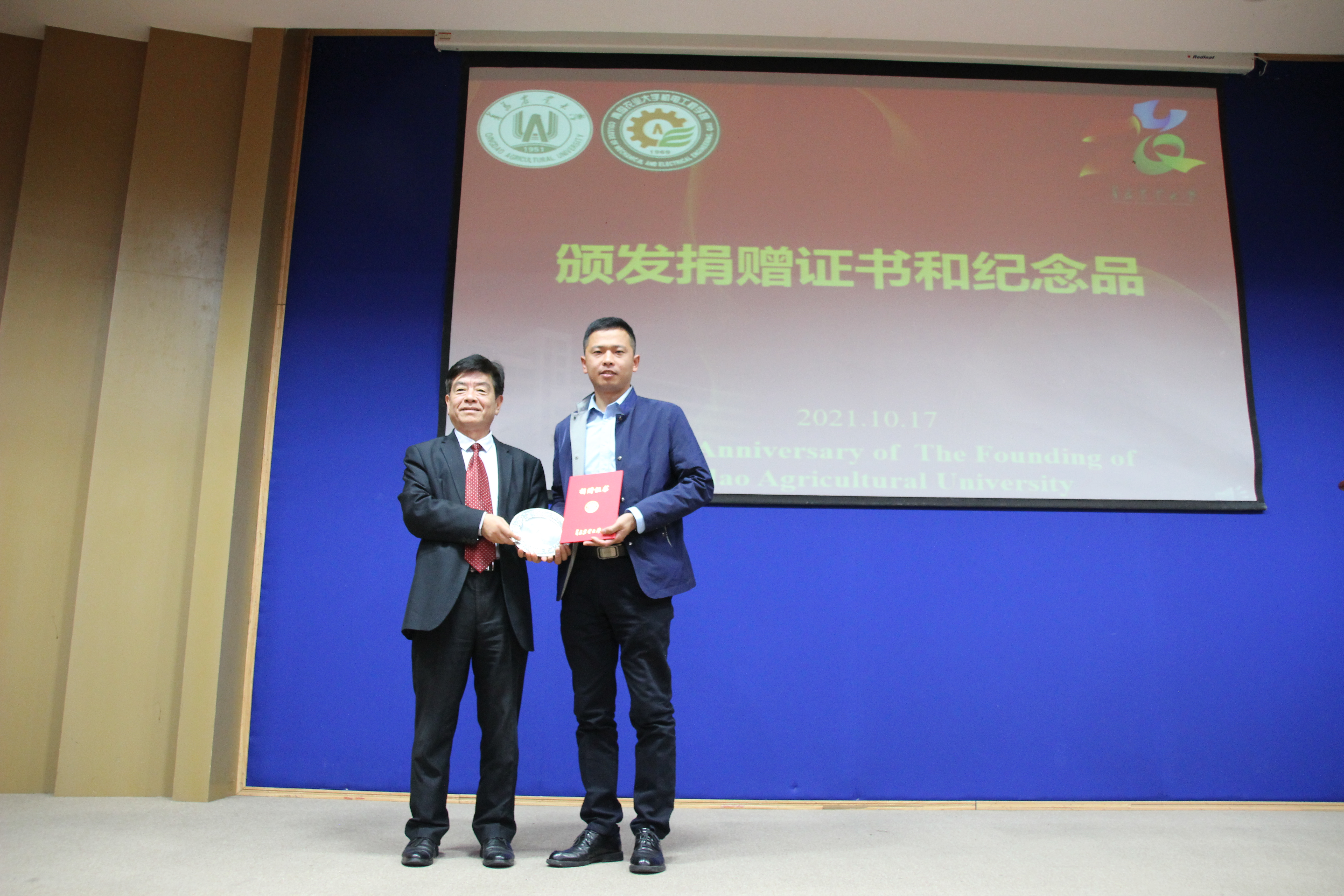 田义轲为山东省章丘鼓风机股份有限公司、青岛洪珠农业机械有限公司、山东源泉机械有限公司、青岛普兰泰克机械科技有限公司、山东赛盟信息科技有限公司、机电行业校友分会等单位颁发了捐赠证书和纪念品。