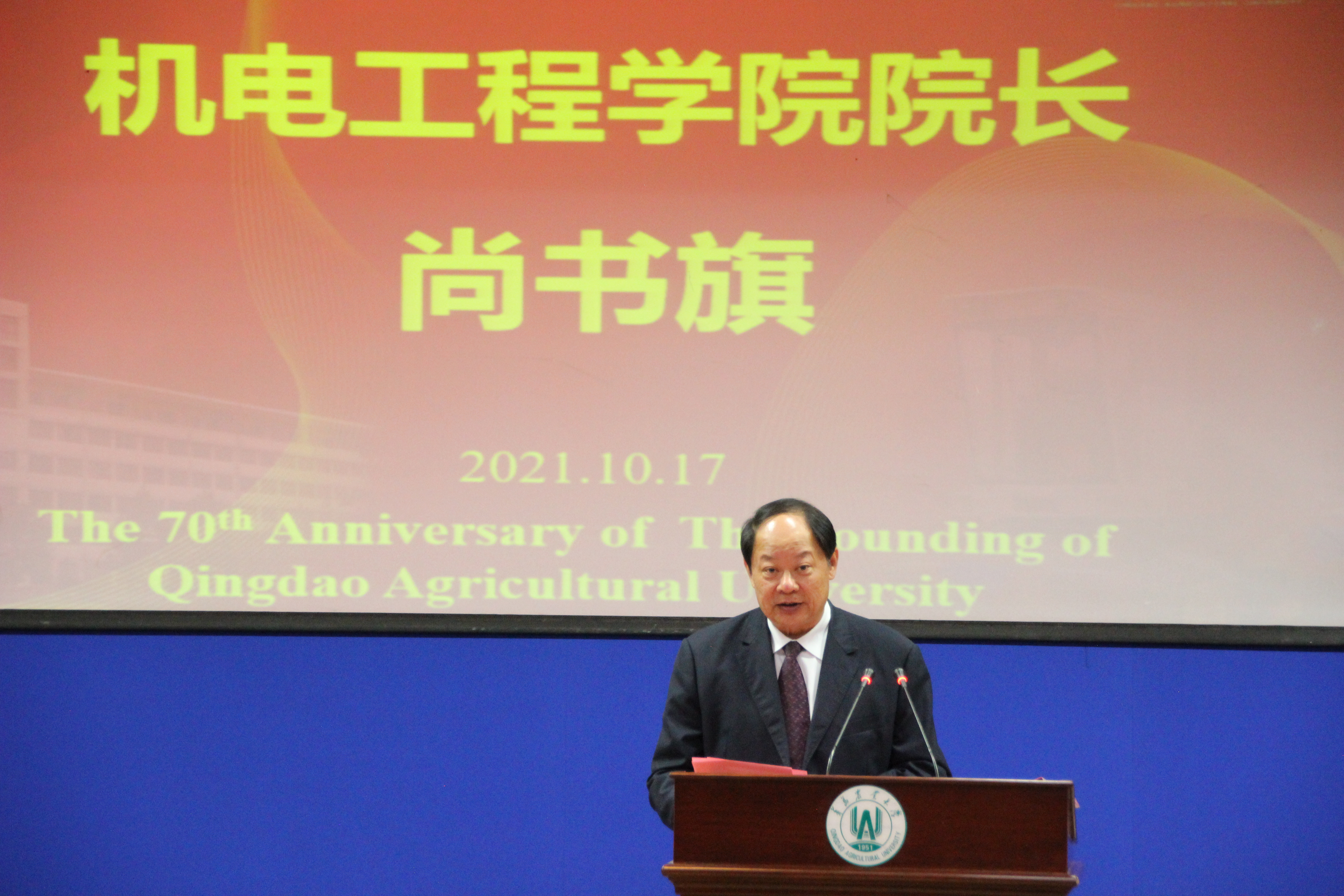 最后,副校长田义轲发表了讲话,他指出,自1951年建校以来,老一辈农机人矢志于我国农机事业的发展,为我国农机人才的培养和农业机械的推广,呕心沥血、不辞辛劳,做出了巨大贡献。一代代机电人秉持“厚德、博学、笃行、致远”的校训,“团结、勤奋、严谨、创新”的学风,学院在人才培养、科学研究、社会服务、文化创新与传承、国际合作与交流等方面取得令人瞩目的成就,发展成为优势突出、特色鲜明的教学研究型学院,为保障国家粮食安全、推动农业科技进步和农业机械化事业发展做出了突出贡献,社会影响力显著增强。他希望学院继续发扬开拓精神,锐意进取、担当作为,以建校70周年为新起点,传承办学经验,弘扬现代教育理念,努力建设成为专业特色鲜明、国内一流、国际上有影响力的教学研究型学院。希望同学们继续秉持校风校训,志存高远、勇于创新、知行合一、脚踏实地、成人成才、回报社会。