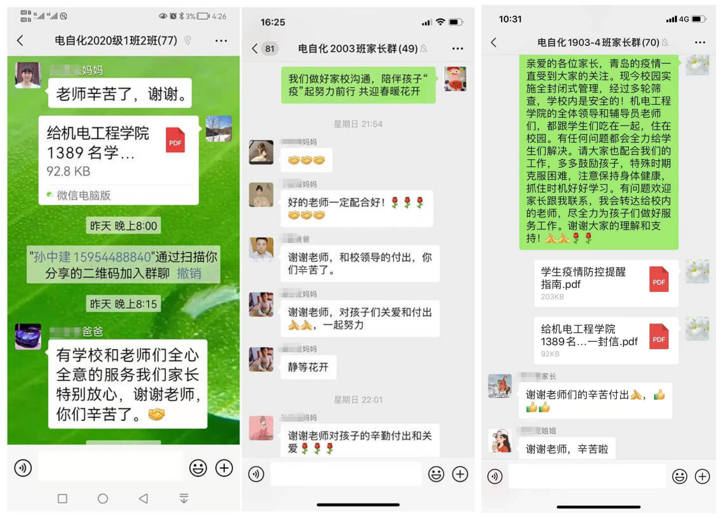 学院发布了《致ok138cn太阳集团古天乐全体学生家长的一封信》,通过电话、微信、QQ等方式向学生家长介绍学校疫情防控举措,及时反馈学生在校的学习和生活情况,细致了解学生家长和学生的需求,及时解疑答惑,赢得了学生家长的理解和支持。学生家长纷纷表示支持学校疫情防控举措,学生在学校学习生活很放心,相信在全校师生的共同努力下,定会打赢疫情防控阻击战,迎来相聚时刻。