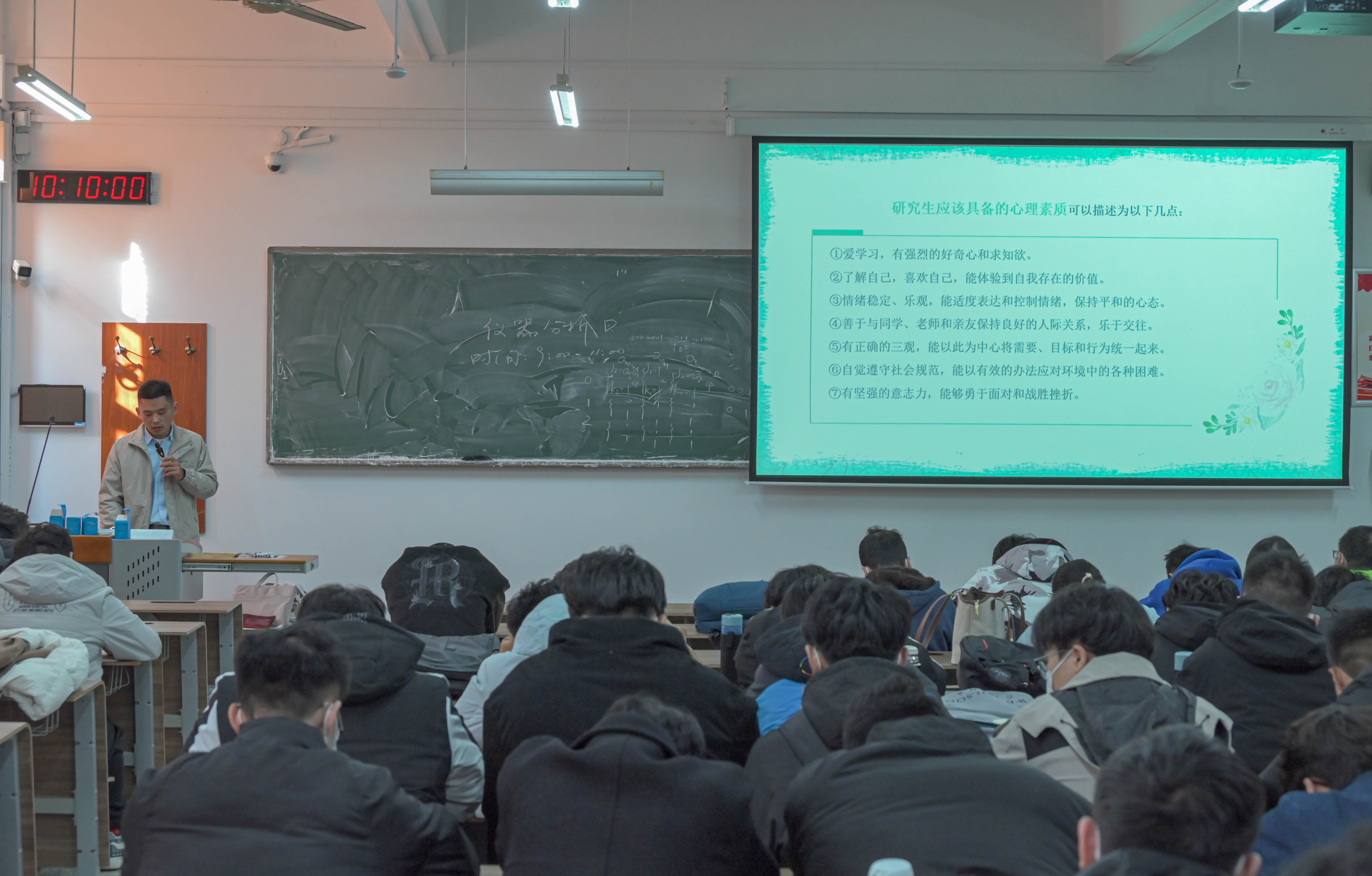 讲座上,迟名龙详细讲解了心理健康在研究生阶段的重要性,对心理健康的标准、重要性以及存在心理疾病所带来的严重危害等方面。他提醒研究生们要重视自身身心健康,养成积极健康的心理习惯。随后,迟名龙分享了有效的心理调节方法,以帮助研究生们建立健康的心理状态。讲座的最后阶段设置现场提问环节,针对研究生同学面临的科研压力、人际关系压力等,老师分享了有效缓解压力的秘诀,引导全体研究生直面自己的内心,充分了解自己的身心状态,发掘压力的好处,将压力化为动力。