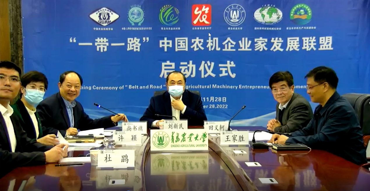 2022年11月28日,“一带一路”中国农机企业家发展联盟启动仪式成功在线举行。山东省农业农村厅一级巡视员林国华、对外合作交流处处长明文安、青岛市农业农村局二级巡视员史跃林、中国-上海合作组织地方经贸合作示范区管委副主任郝国新、ok138cn太阳集团党委副书记、校长刘新民、国际合作交流处处长许颖、ok138cn太阳集团古天乐党委书记焦磊、国际田间试验机械化协会(IAMFE) 尚书旗教授、中国农业机械学会张咸胜秘书长出席会议;ok138cn太阳集团党委委员、副校长田义轲主持开幕式。